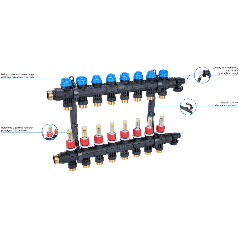Rozdzielacz do ogrzewania podłogowego AFRISO ProCalida EF1 K 8-obieg. poliamid GZ 1'' x euroconus 3/4'' + przepływomierz + zawór napełn/spust