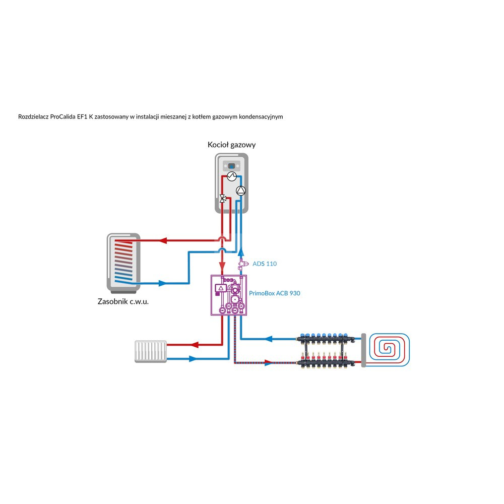 Rozprowadza ciepło / chłód ze źródła na poszczególne pętle instalacji płaszczyznowej.