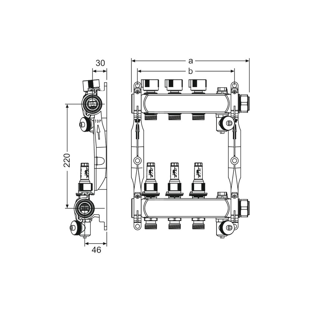 Rozdzielacz ogrzewania podłogowego ze stali nierdzewnej. Belka rozdzielacza obwodów grzewczych o dużym przekroju wewnętrznym komory, powierzchnia polerowana, dźwiękochłonne uchwyty wykonane z tworzywa do szybkiego montażu z półśrubunkiem 1" i płaską uszczelką. Zintegrowane wkładki zaworowe powrotne z podwójnym uszczelnieniem typu O-ring na popychaczu zaworu, grzybek zaworu z o-ringiem dla bezpiecznego zamykania obwodów ogrzewania, przepływomierze z zakresem regulacji 0,5-4 l/min z blokadą oraz możliwością odcięcia przepływu zgodne z normą PN-EN 1264-4.