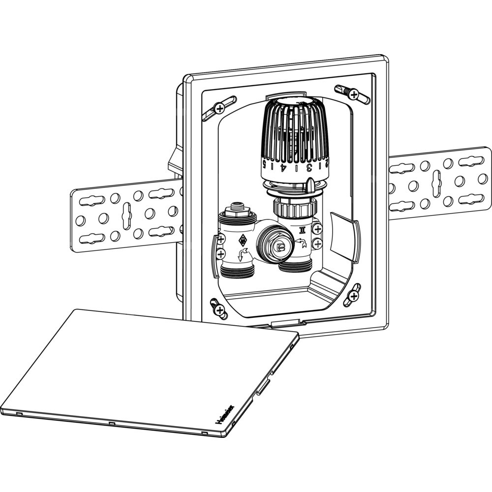 Multibox stosowany jest do regulacji ogrzewania podłogowego, ogrzewania płaszczyznowego, oraz mieszanych układów ogrzewania grzejnikowego i podłogowego w pojedynczych pomieszczeniach. Wyrównanie w razie zabudowy odchylonej od pionu do 6° dla każdej ze stron. Pokrywa maskująca śruby mocujące. Models in white or chrome. Możliwość montażu we wszystkich rodzajach ścian z kompensacją głębokości do 30 mm.