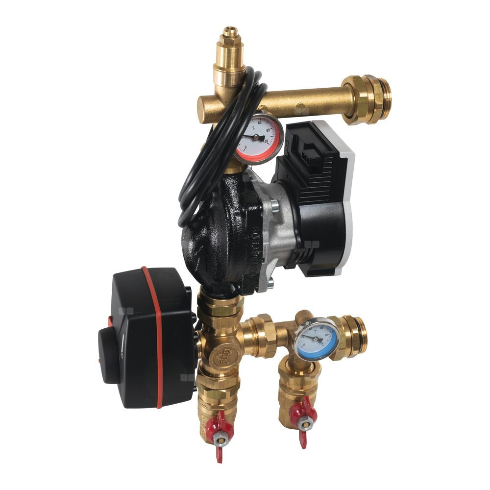Grupa mieszająca z zaworem trójdrogowym i siłownikiem liniowym (0-10 V) przeznaczona do stosowania ze sterowaniem pogodowym. Możliwość łączenia z rozdzielaczami mosiężnymi oraz ze stali nierdzewnej systemu TECEfloor. Urządzenie przeznaczone jest do nowoczesnych systemów grzewczych z niskotemperaturowym źródłem ciepła. Temperatury wody dochodzącej z kotłowni powinna być min. O 5 °C wyższa niż zadeklarowana dla zasilania ogrzewania podłogowego.