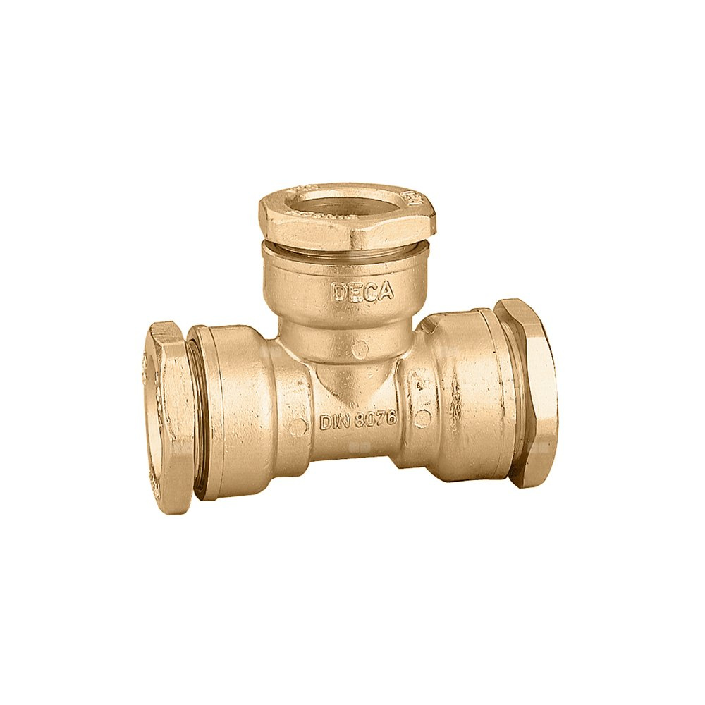 Trójnik. Do rur żelaznych. Przyłącze: Ø 27. Maksymalne ciśnienie pracy: 16 bar. Zakres temperatury medium: 0–40 °C. Materiał: mosiądz.