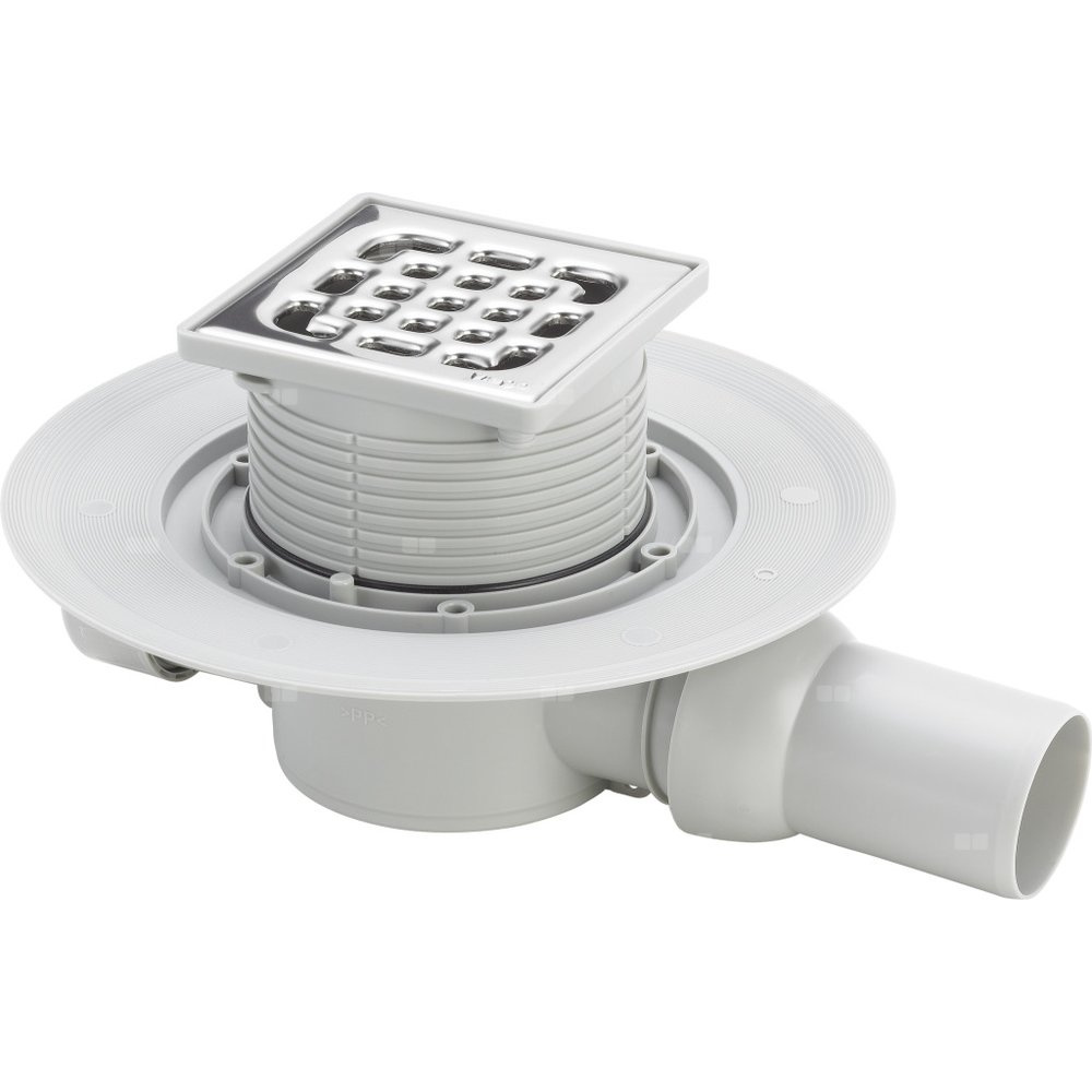 Advantix-odpływ łazienkowy, wymiar systemowy 100. Wyposażenie: Obracana nasadka 100×100 mm z regulacją wysokości, ramka z tworzywa sztucznego, korek, ruszt ze stali nierdzewnej 1.4301, kołnierz uszczelniający, syfon wyjmowalny, dopływ DN40, rura odpływowa z przegubem kulowym. Dane techniczne: wysokość zamknięcia wodnego 30 mm, klasa obciążenia K=300 kg, wydajność odpływu przy wysokości spiętrzenia 10 mm 0,4 l/s, wydajność odpływu przy wysokości spiętrzenia 20 mm 0,6 l/s, wydajność odpływu wg PN-EN 1253, nr wzoru 4935.1PL, nr kat. 703 226,