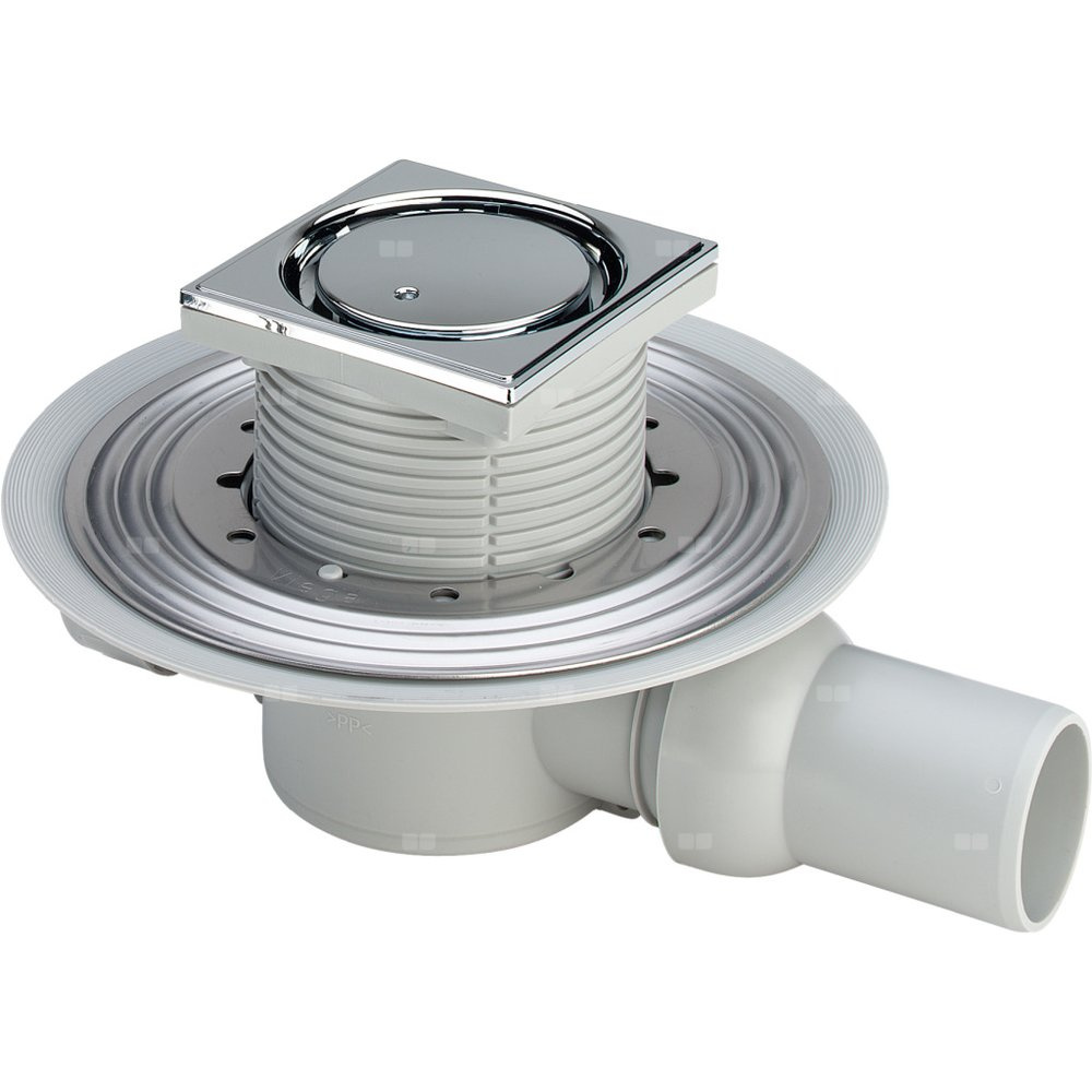 Advantix-odpływ łazienkowy, wymiar systemowy 100. Wyposażenie: Obracana nasadka 100×100 mm z regulacją wysokości, ruszt Visign z tworzywa sztucznego chromowany, korek, kołnierz uszczelniający ze stali nierdzewnej, syfon wyjmowalny, dopływ DN40 (nie przechodzi przez syfon!), rura odpływowa z przegubem kulowym. Dane techniczne: wysokość zamknięcia wodnego 30 mm, klasa obciążenia K=300 kg, wydajność odpływu przy wysokości spiętrzenia 10 mm 0,4 l/s, wydajność odpływu przy wysokości spiętrzenia 20 mm 0,6 l/s, wydajność odpływu wg PN-EN 1253, nr wzoru 4936.1, nr kat. 467 395,