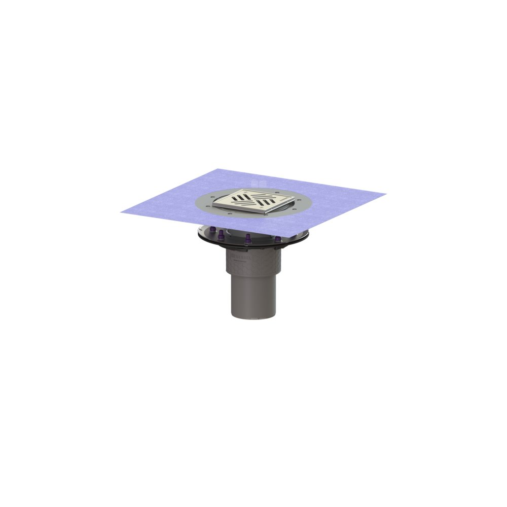 Wpust podłogowy/stropowy Practicus z tworzywa sztucznego służy do odwodnienia punktowego i jest wyposażony w dociskowy kołnierz uszczelniający oraz wyjmowany syfon, uszczelkę wargową i pokrywę ochronną na czas fazy budowlanej. Z nasadą z ABS z teleskopową regulacją wysokości. Wpust spełnia szczególne wymagania w zakresie izolacyjności akustycznej zgodnie z pomiarami Instytutu Frauenhofera w Stuttgarcie. Dociskowy kołnierz uszczelniający z bolcami i śrubami ze stali nierdzewnej służy do dociskania lub zgrzewania taśm bitumicznych i polimerowo-bitumicznych oraz taśm uszczelniających z tworzywa sztucznego i elastomerów. Do uszczelnień wodoszczelnych mogą być stosowane tylko sprawdzone przez producenta membrany hydroizolacyjne.
