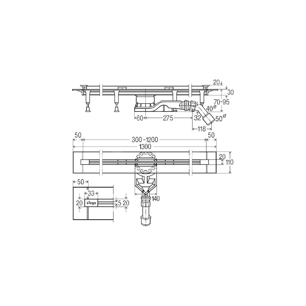 Odpływ prysznicowy prostokątny VIEGA 496610, 1300 x 110 x 70 mm, dł: 1200 mm, szer: 20 mm, z syfonem