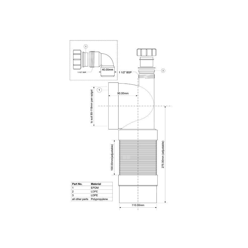 Przyłącze kanalizacyjne harmonijkowe L-270>540mm,wejście 90-110mm,wyjście 110mm, kąt 90 z podłączeniem 40mm