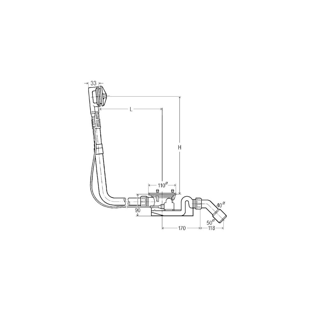 Rotaplex-komplet odpływowo-przelewowy jednostka funkcyjna wyposażenie, Syfon, łuk odpływowy 45 st., nr wzoru 6142.32 DN: 40/50 długość cięgna Bowdena: 725 L: 150–400 H: 180–430 wanna z odpływem pośrodku do wanien z otworem odpływowym fi 90