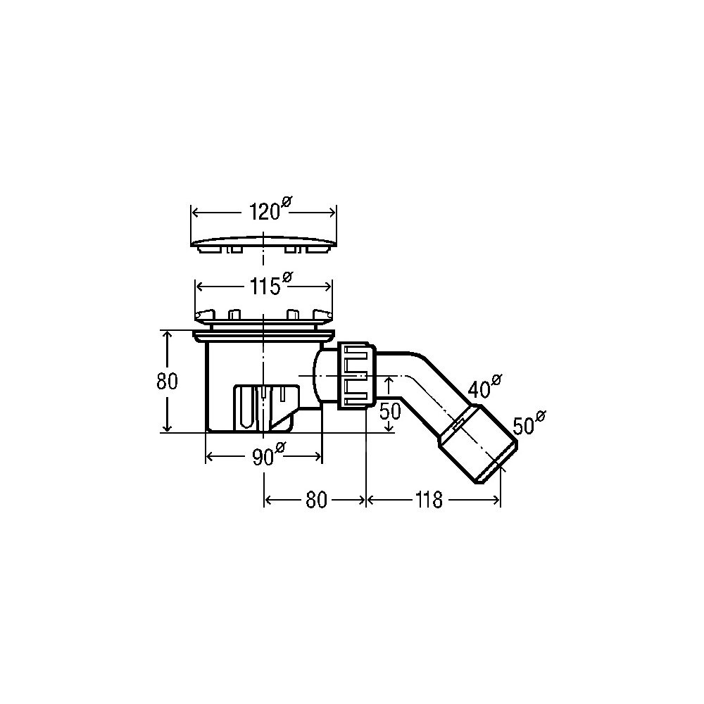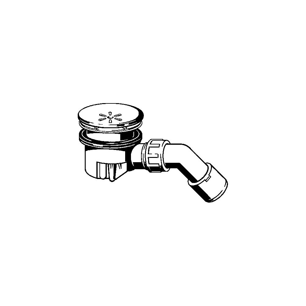 Tempoplex-odpływ. Wyposażenie: Syfon wyjmowalny, łuk odpływowy 45°, kołpak chromowany. Dane techniczne: wysokość zamknięcia wodnego 50 mm, wydajność odpływu przy wysokości spiętrzenia 15 mm 0,45 l/s, wg PN-EN 274, nr wzoru 6956EX, nr kat. 364 786,