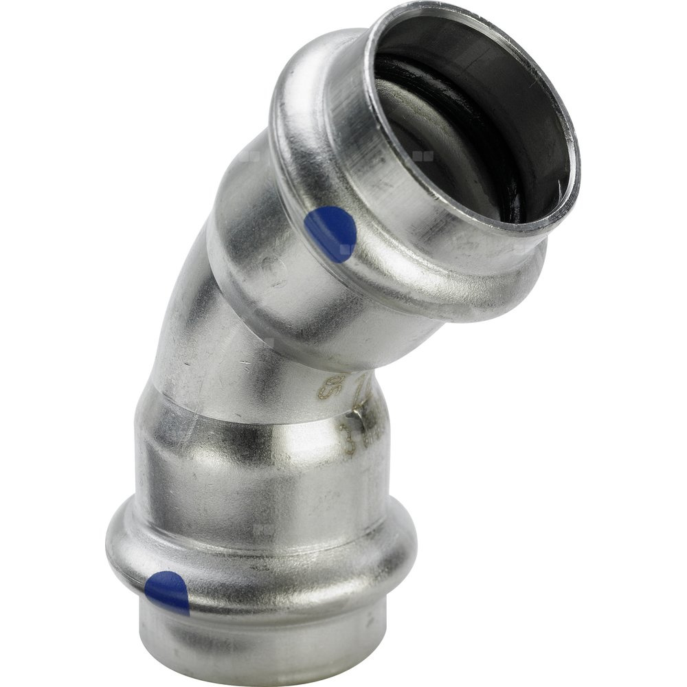Sanpress Inox LF -łuk 45° z SC-Contur labs-frei (odtłuszczone) (opakowanie pojedyncze) - stal nierdzewna - przyłącza zaprasowywane. Wyposażenie: Elementy uszczelniające EPDM nr wzoru 2326LF nr kat. 664 923 d: 54