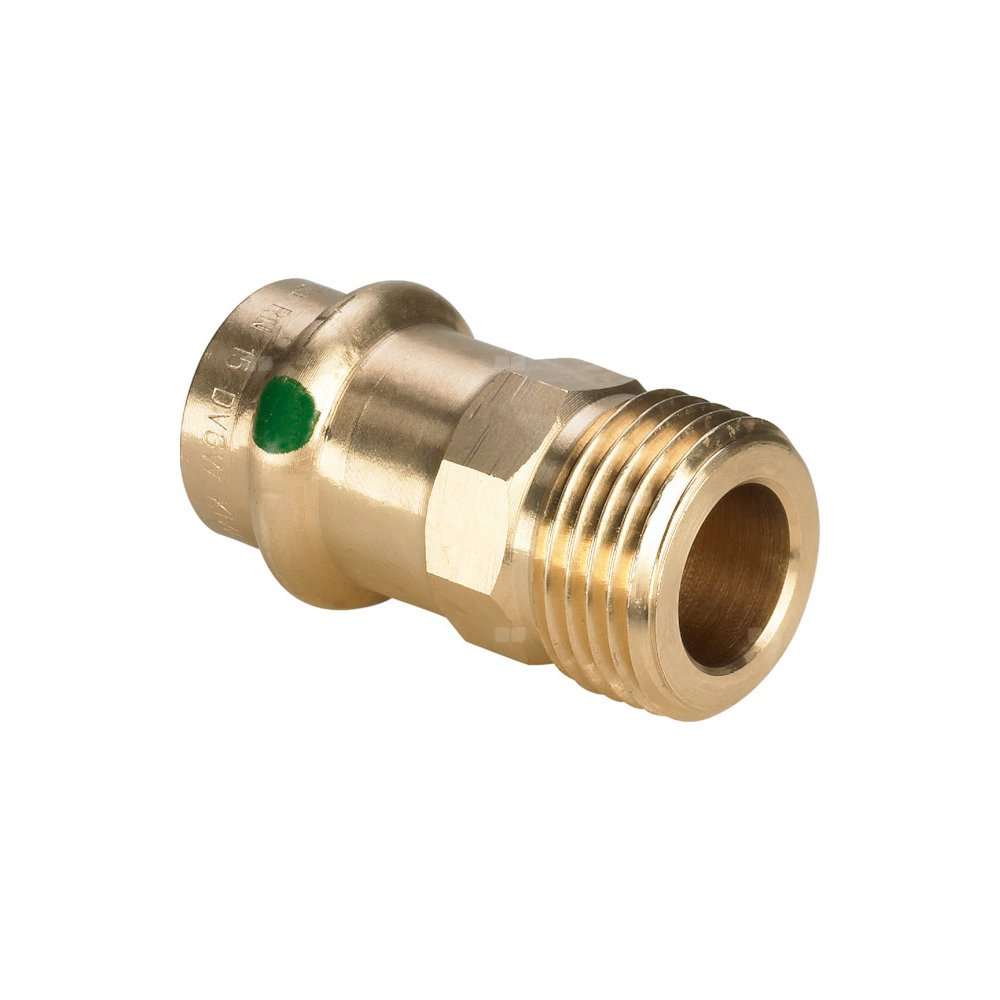 Sanpress-złączka przejściowa, z SC-Contur. Przeznaczenie: dwuzłączka przyłączeniowa, brąz lub brąz krzemowy, przyłącze zaprasowywane, gwint G. Wyposażenie: Element uszczelniający EPDM, wielokąt, nr wzoru 2211.4, nr kat. 660 222, d: 15 G: ½
