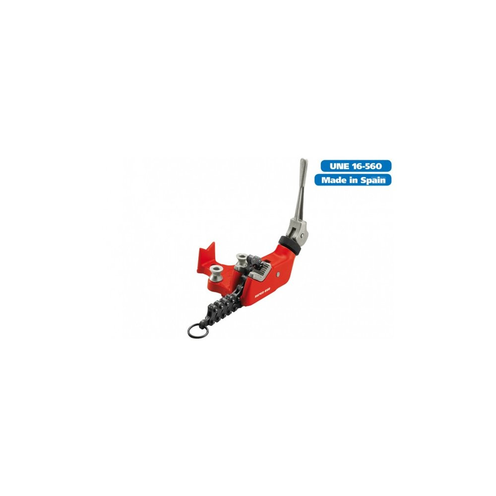 Szybki chwyt rury za pomocą łańcucha, radełkowanej śruby z nakrętką i bocznej dźwigni z krzywką.