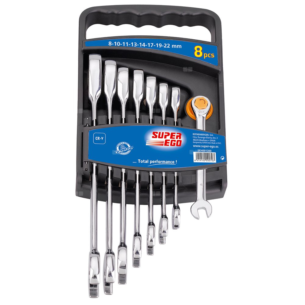 Zestaw 8 szt. kluczy płaskich z grzechotką ze stali chromowo-wanadowej (CrV).