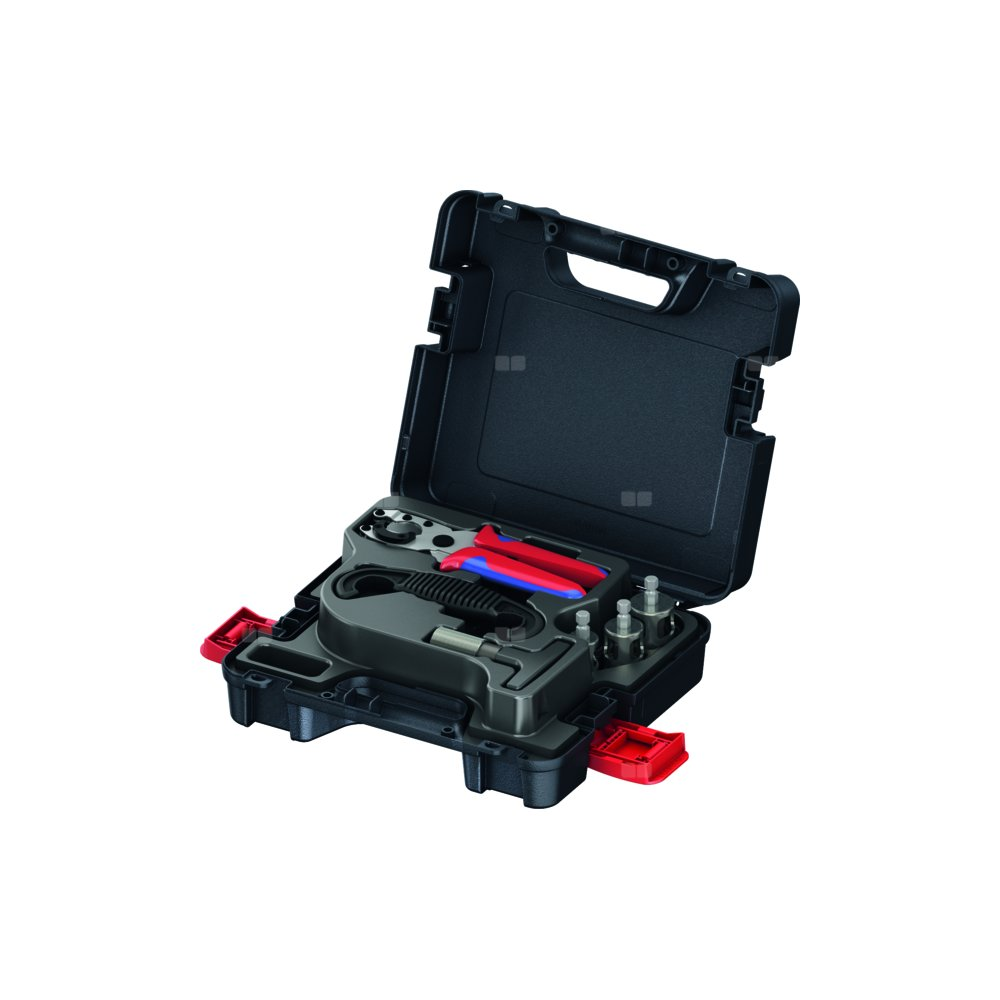 Walizka narzędziowa z nożycami do cięcia rur, narzędziami do kalibrowania i fazowania, uchwytami i narzędziami do demontażu.