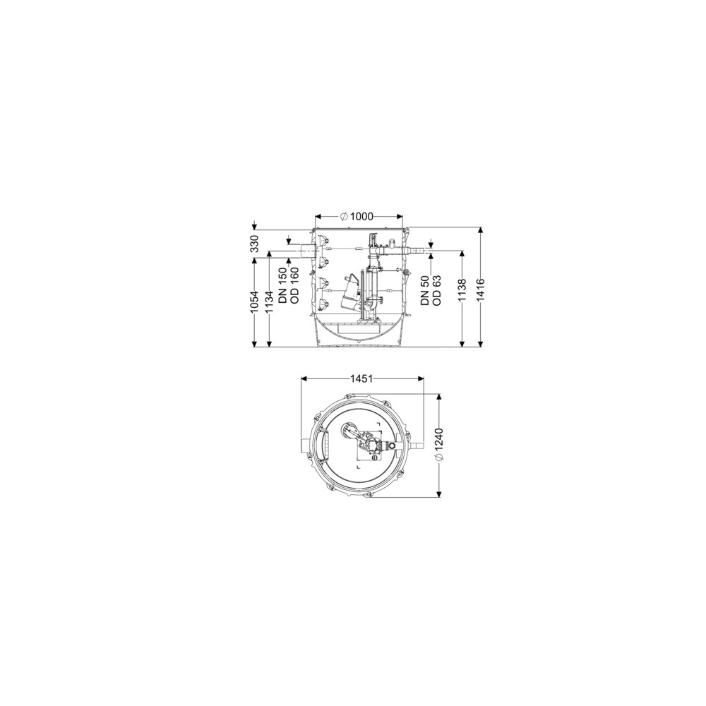 - Odstęp między dnem rury dopływowej a dnem zbiornika: 1054 mm