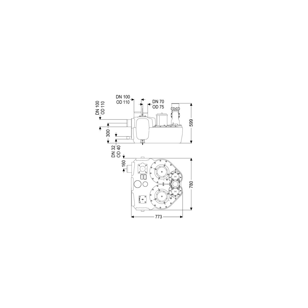 KESSEL Przepompownia Aqualift F Duo, ścieki fekalne, typ pracy S1, wys. podnoszenia 8 m, sterownik Standard, wysokość 539 mm, z 2 SPF 1500 pomp zatapialnych, króciec tłoczny pionowy, zasuwa odcinająca bez zasuwy odcinającej