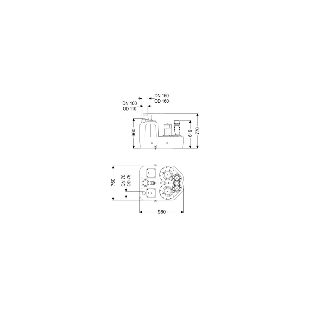 Przepompownia do ścieków zawierających fekalia i bez fekaliów jjest wyposażony w jedną lub dwie pompy zatapialną oraz zawór zwrotny. Pojemnik zbiorczy wykonany z wytrzymałego tworzywa sztucznego (PE) oferuje uniwersalne możliwości podłączenia i posiada przykręcany otwór wyczystkowy.