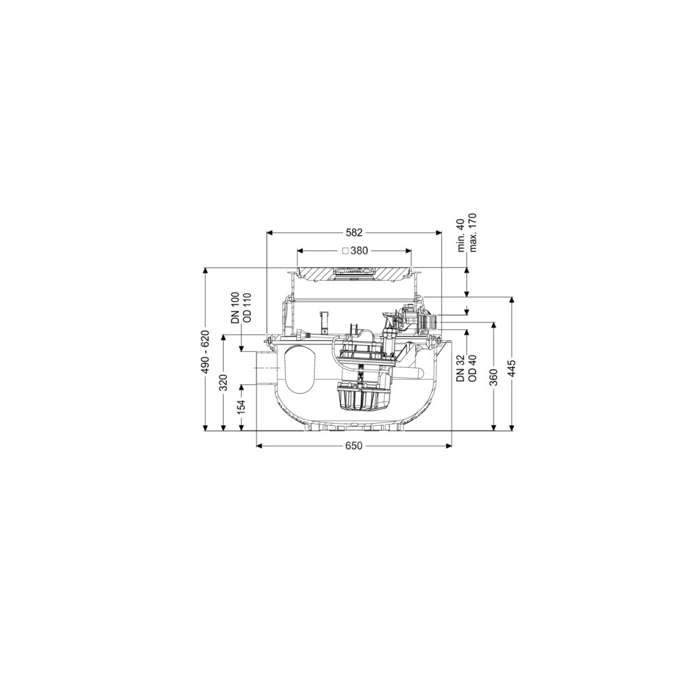 Gotowa do przyłączenia przepompownia do ścieków bez fekaliów jest wyposażony w jedną lub dwie pompy zatapialną oraz zawór zwrotny. Zbiornik wykonany z trwałego tworzywa sztucznego (PE) posiada otwartą komorę pompy. Zamknięcia jednoręczne umożliwiają łatwe wyjęcie zintegrowanych komponentów. Urządzenie do zabudowy w płycie podłogowej jest wstępnie zmontowane do montażu końcowego w miejscu instalacji.