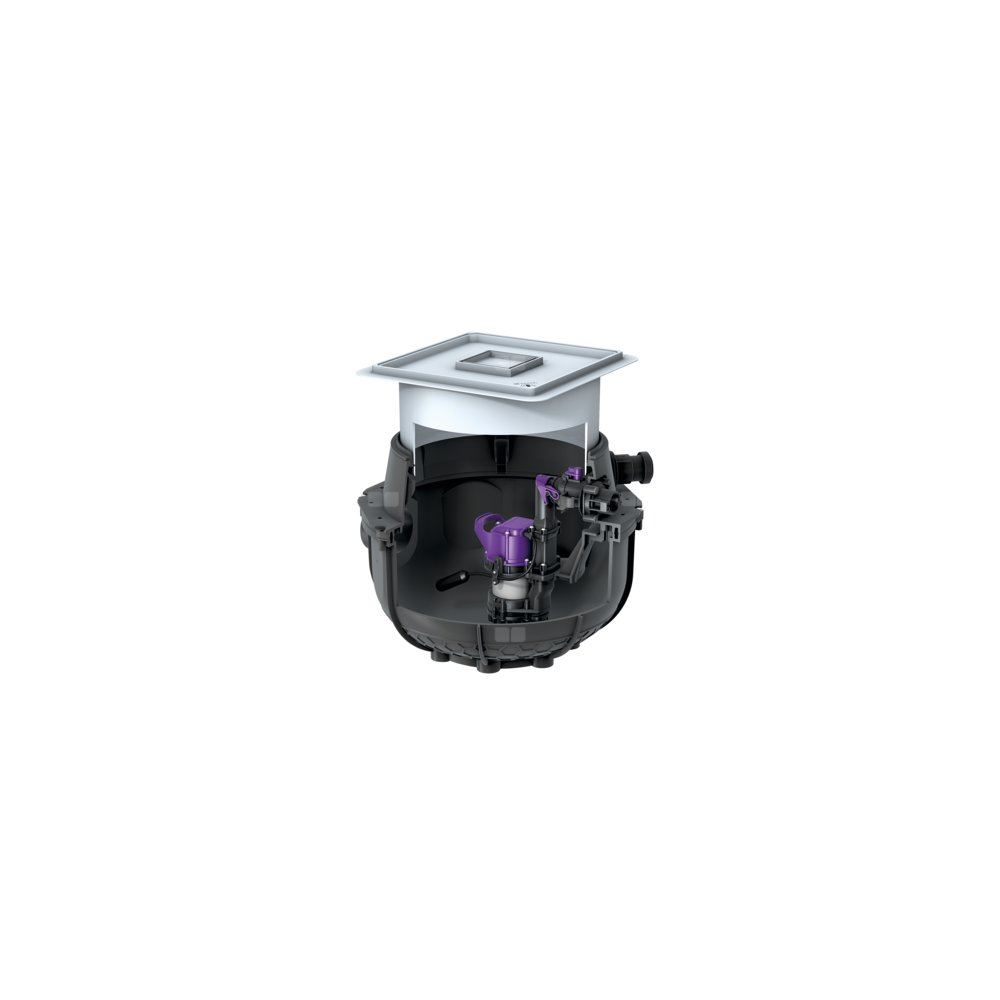 Gotowa do przyłączenia przepompownia do ścieków bez fekaliów jest wyposażony w jedną lub dwie pompy zatapialną oraz zawór zwrotny. Zbiornik wykonany z trwałego tworzywa sztucznego (PE) posiada otwartą komorę pompy. Zamknięcia jednoręczne umożliwiają łatwe wyjęcie zintegrowanych komponentów. Urządzenie do zabudowy w płycie podłogowej jest wstępnie zmontowane do montażu końcowego w miejscu instalacji.