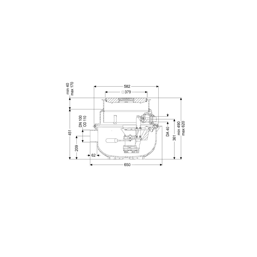 KESSEL Przepompownia Aqualift S Compact Mono, ścieków Ścieki bez fekaliów, zabudowa w płycie podłogowej, z pompą zatapialną GTF 500 resistant, rozpoznawania poziomu Przełącznik pływakowy, typ pokrywy pokrywa z rusztem szczelinowym, czarny