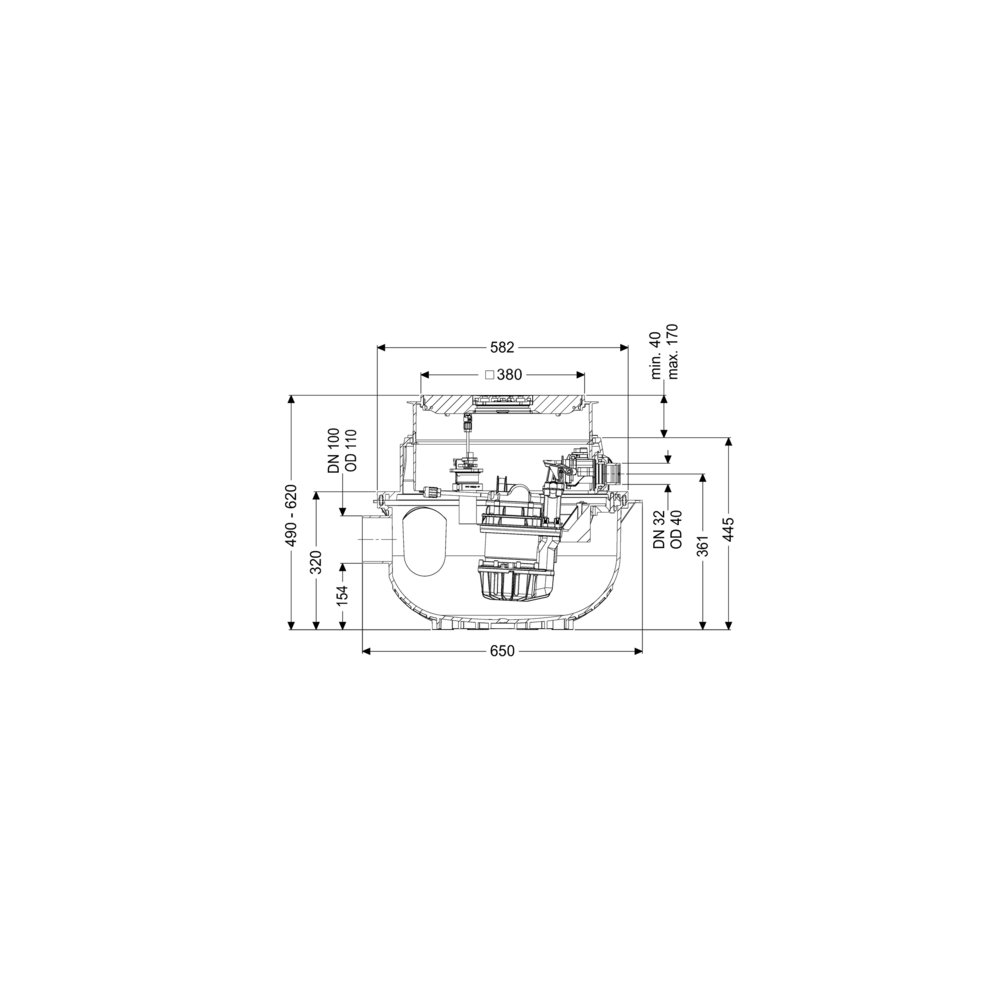 Gotowa do przyłączenia przepompownia do ścieków bez fekaliów jest wyposażony w jedną lub dwie pompy zatapialną oraz zawór zwrotny. Zbiornik wykonany z trwałego tworzywa sztucznego (PE) posiada otwartą komorę pompy. Zamknięcia jednoręczne umożliwiają łatwe wyjęcie zintegrowanych komponentów. Urządzenie do zabudowy w płycie podłogowej jest wstępnie zmontowane do montażu końcowego w miejscu instalacji.