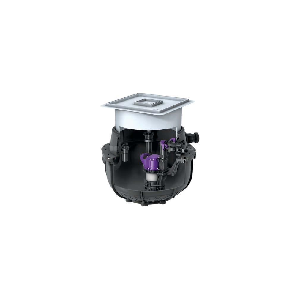 Gotowa do przyłączenia przepompownia do ścieków bez fekaliów jest wyposażony w jedną lub dwie pompy zatapialną oraz zawór zwrotny. Zbiornik wykonany z trwałego tworzywa sztucznego (PE) posiada otwartą komorę pompy. Zamknięcia jednoręczne umożliwiają łatwe wyjęcie zintegrowanych komponentów. Urządzenie do zabudowy w płycie podłogowej jest wstępnie zmontowane do montażu końcowego w miejscu instalacji.
