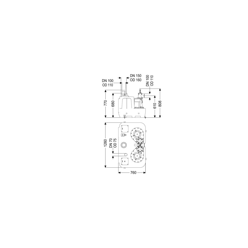 Przepompownia do ścieków zawierających fekalia i bez fekaliów jjest wyposażony w jedną lub dwie pompy zatapialną oraz zawór zwrotny. Pojemnik zbiorczy wykonany z wytrzymałego tworzywa sztucznego (PE) oferuje uniwersalne możliwości podłączenia i posiada przykręcany otwór wyczystkowy.
