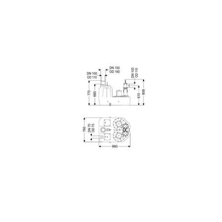 Przepompownia do ścieków zawierających fekalia i bez fekaliów jjest wyposażony w jedną lub dwie pompy zatapialną oraz zawór zwrotny. Pojemnik zbiorczy wykonany z wytrzymałego tworzywa sztucznego (PE) oferuje uniwersalne możliwości podłączenia i posiada przykręcany otwór wyczystkowy.