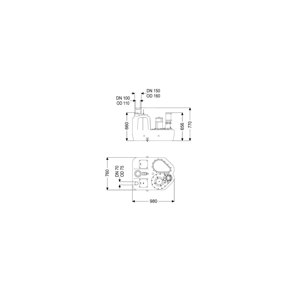 Przepompownia do ścieków zawierających fekalia i bez fekaliów jjest wyposażony w jedną lub dwie pompy zatapialną oraz zawór zwrotny. Pojemnik zbiorczy wykonany z wytrzymałego tworzywa sztucznego (PE) oferuje uniwersalne możliwości podłączenia i posiada przykręcany otwór wyczystkowy.