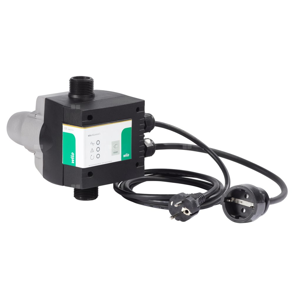 HiControl 1-EK elektronicznie sterowany czujnik ciśnienia i przepływu z zabezpieczeniem przed suchobiegiem i przepływem zwrotnym. Dodatkowo kabel podłączeniowy 2,5 m z wtyczką ze stykiem ochronnym i gniazdkiem do podłączenia pompy.