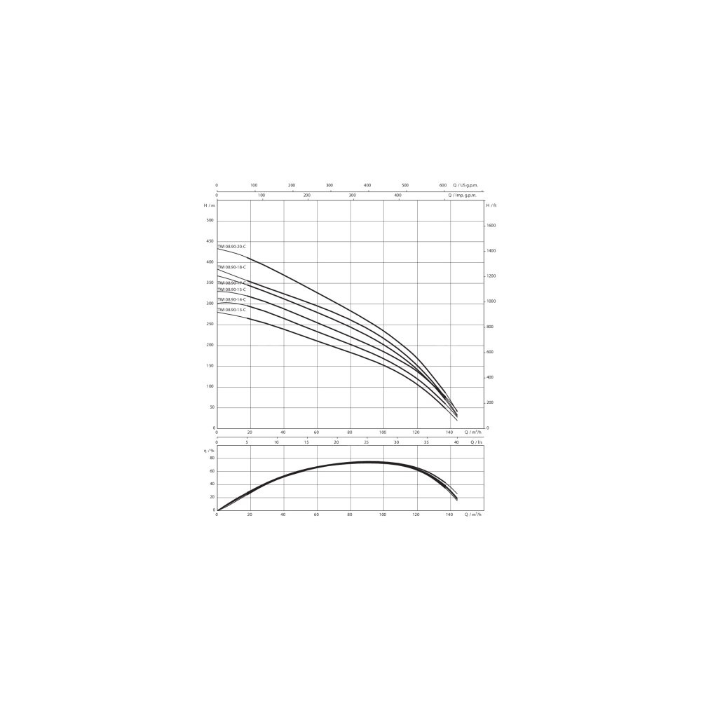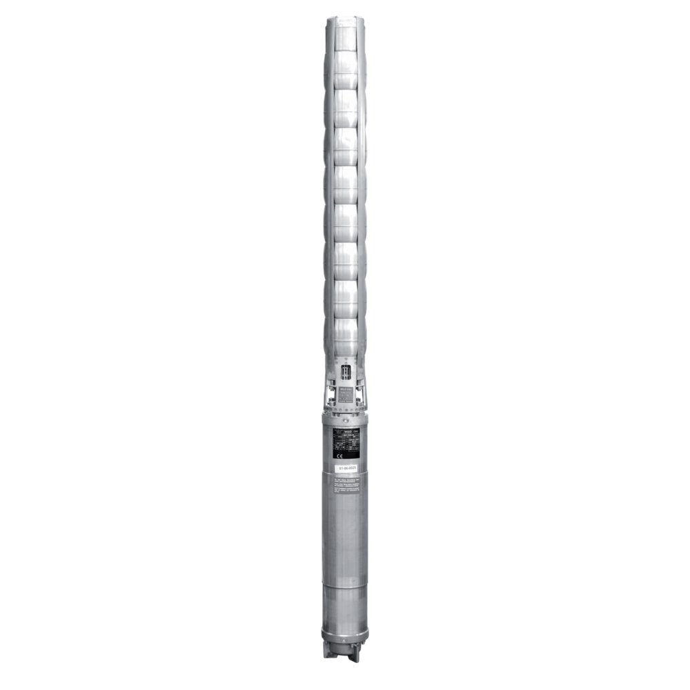 Całkowicie zanurzona, wielostopniowa pompa głębinowa do tłoczenia wody użytkowej (certyfikat ACS), z promieniowymi lub półosiowymi wirnikami o budowie segmentowej, do montażu pionowego i poziomego, z wbudowanym zaworem zwrotnym. Odporny na korozję silnik indukcyjny trójfazowy do rozruchu bezpośredniego lub gwiazda-trójkąt, napełniony mieszaniną wody i glikolu lub alternatywnie wodą użytkową. Hermetycznie zalany silnik, z uzwojeniem emaliowanym, impregnowany żywicą lub przezwajalny silnik z uzwojeniem izolowanym PVC i łożyskami samosmarującymi. Silnik chłodzony jest przez przetłaczane medium. Dlatego podczas pracy urządzenie musi być zawsze zanurzone. Przestrzegać wartości granicznych max. temperatury przetłaczanej cieczy i minimalnej prędkości przepływu. Montaż pionowy jest opcjonalnie możliwy z płaszczem chłodzącym lub bez niego. Przy montażu poziomym płaszcz chłodzący jest zawsze konieczny.