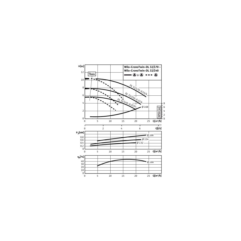 Pompa obiegowa WILO CronoTwin-DL 32/150-0,37/4 typu in-line z silnikiem znormalizowanym 50 Hz, moc silnika 0.37kW 1.06 A 1450 obr/min, wlot Kołnierz DN 32