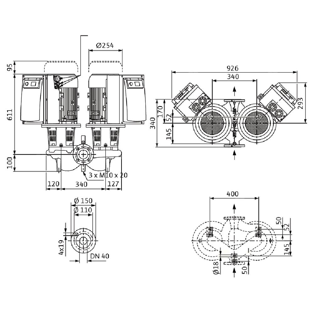Dławnicowa pompa podwójna o konstrukcji Inline do montażu na rurociągu lub do ustawienia na fundamencie z wbudowaną przetwornicą częstotliwości do regulacji elektronicznej m.in. wg stałej i zmiennej różnicy ciśnień (Δp-c/Δp-v)