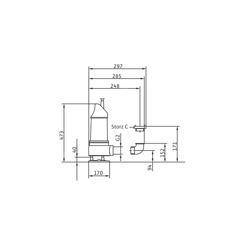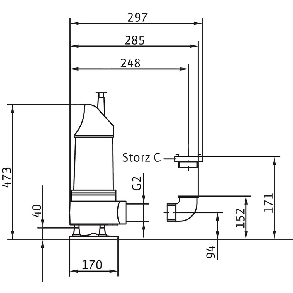 Całkowicie zanurzona pompa zatapialna do wody zanieczyszczonej, pionowe ustawienie mokre, do tłoczenia wody zanieczyszczonej i zawierającej piasek Korpus hydrauliczny i wirnik z żeliwa szarego, korpus silnika z aluminium. Przyłącze tłoczne z pionowym odpływem ciśnieniowym i złączem typu Storz. Samochłodzący silnik w wersji na prąd trójfazowy, z odłączanym kablem zasilającym z wyłącznikiem pływakowym i wtyczką wg standardu CEE z funkcją zamiany faz. Do uszczelnienia po stronie medium i silnika służy uszczelnienie mechaniczne. Agregat można stosować w podsysającym trybie pracy bez ograniczeń.