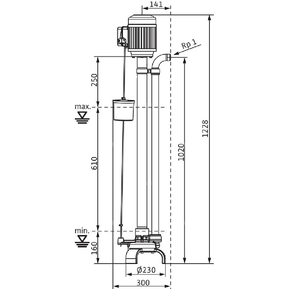 Pionowa pompa do wody brudnej w ścianie nienośnej do tłoczenia mediów o temperaturze maks. 95 oC, korpus hydrauliczny z żeliwa szarego, wirnik ze stali. Przyłącze tłoczne z poziomym odpływem ciśnieniowym i gwintem wewnętrznym. Napęd następuje poprzez silnik znormalizowany w wersji na prąd trójfazowy, korpus silnika z aluminium. Zabezpieczenie silnika i kabel zasilający zapewnia Użytkownik. Hydraulika i silnik są sztywno połączone za pomocą wału pompy (w rurze ochronnej wału). Łożyskowanie wału pompy następuje przez łożyska ślizgowe, smarowanie łożysk ślizgowych przez przetłaczane medium. Celem automatycznej pracy zamontowano wyłącznik pływakowy. Punkty przełączania można regulować za pomocą ograniczników.