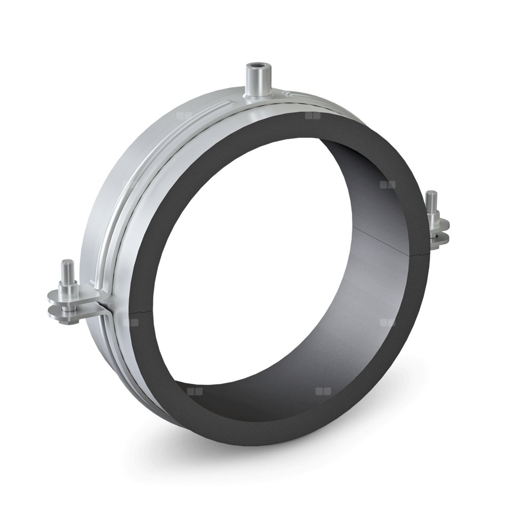 Materiał: wkładka poliuretanowa o gęstości 80 kg/m3 otulony czarną akustyczną folią, na zewnątrz obejma stalowa ocynkowana znakretką montażową