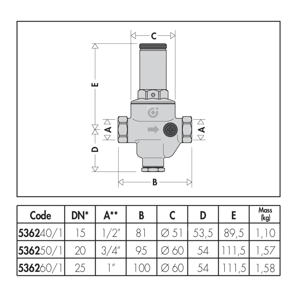 Regulator ciśnienia z wymiennym wkładem. Przyłącza z gwintem wewnętrznym. Przyłącze: G 3/4" (ISO 228-1) GW. Maksymalne ciśnienie wlotowe: 25 bar. Zakres temperatury medium: 2–80 °C. Zakres regulowanego ciśnienia: 0,5–6 bar. Materiał: stop mosiądzu odporny na odcynkowanie.