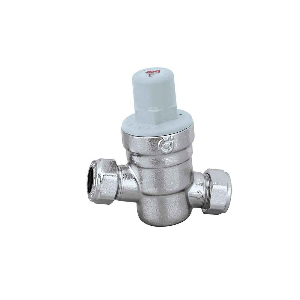 Regulator ciśnienia ze złączkami zaciskowymi – wersja skośna Wkład i filtr wymienny. Przyłącze: Ø 22. Maksymalne ciśnienie wlotowe: 16 bar. Zakres temperatury medium: 2–40 °C. Zakres regulowanego ciśnienia: 1–6 bar. Wykończenie: chromowane. Materiał: stop mosiądzu odporny na odcynkowanie.