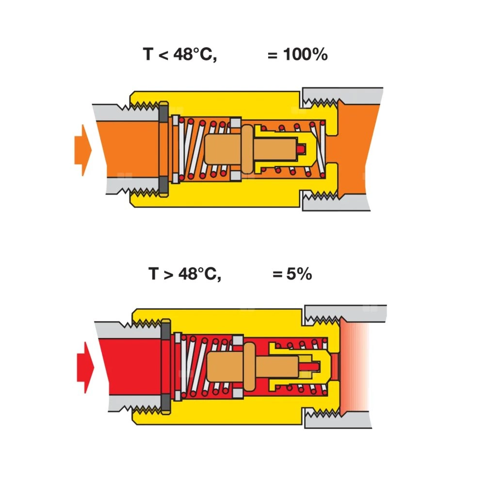 Urządzenie antyoparzeniowe do domowych układów c.w.u. Przyłącze: 1/2" SWT. Nastawa: 48 °C. Wykończenie: chromowane. Materiał: mosiądz.