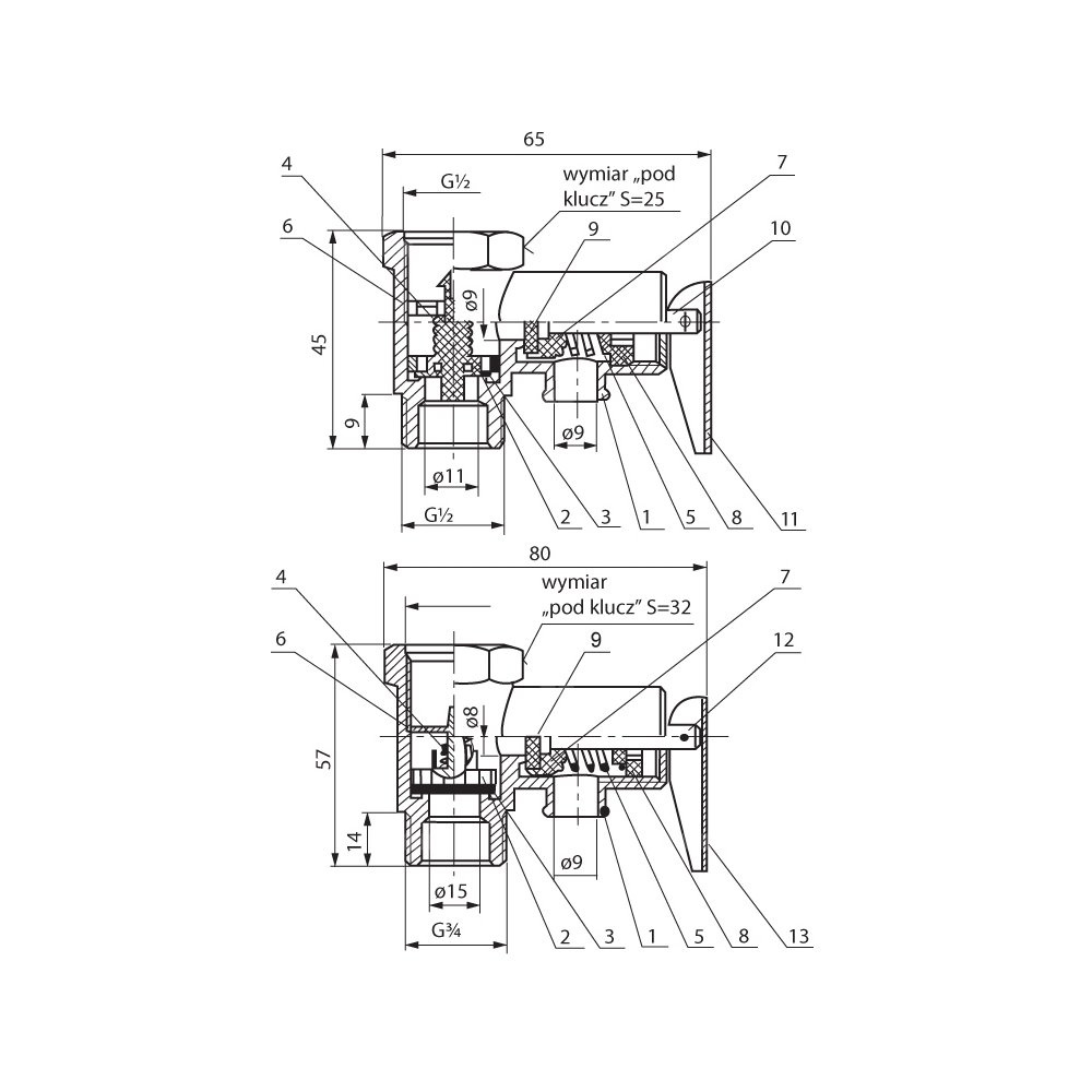 Zawory bezpieczeństwa z zaworem zwrotnym i spustem są przeznaczone do zabezpieczania przed nadmiernym wzrostem ciśnienia oraz utrzymywania jednego kierunku przepływu w grzewczych instalacjach wody o maksymalnej temperaturze roboczej +100 °C. W przypadku wzrostu ciśnienia roboczego ponad dopuszczalne (pn=0,7 MPa) następuje upust cieczy poprzez króciec spustowy. Zawory bezpieczeństwa z zaworem zwrotnym muszą być montowane zgodnie z kierunkiem przepływu czynnika roboczego oznakowanego strzałką na kadłubie. Ciśnienie nastawy (otwarcia) zaworu bezpieczeństwa pn=0,7 MPa, nastawione jest fabrycznie w sposób trwały bez możliwości regulacji. Do zabezpieczenia przed przywarciem uszczelki grzybka zaworu bezpieczeństwa (9) do siedziska w kadłubie, np. pod wpływem osadzającego się kamienia należy okresowo (co 10 dni) za pomocą dźwigni (11) lub (13) dokonać uniesienia grzybka (7).