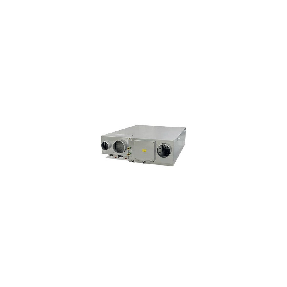 W komplecie z wymienną sekcją filtrów z materiałów syntetycznych, klasa G3 (EN779:2002), 2 bezszczotkowe wentylatory połączone bezpośrednio z trzybiegowym silnikiem, 5 tłumików, obieg chłodzący z czynnikiem gazowym R134a, obieg hydrauliczny: wężownica z rur miedzianych i aluminiowych lameli, 5 kanałów (średnica 100 mm) zasilania, recyrkulacji, ekstrakcji, mieszania i wyrzutu.