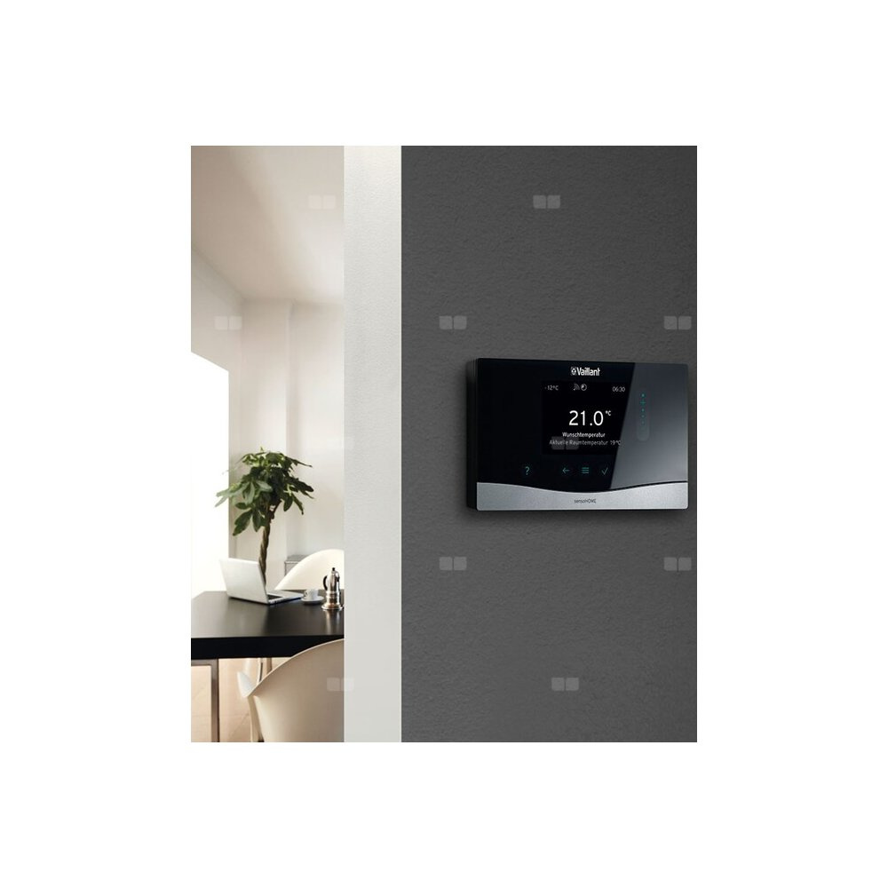ze złączem komunikacyjnym eBUS, wyświetlaczem dotykowym, z zegarem programującym tygodniowym, sterujący obiegiem c.o., obiegiem c.w.u.,(komfortem c.w.u./zasobnikiem c.w.u./zasobnikiem warstwowym actoSTOR), oraz pompą cyrkulacyjną i/lub zewnętrzną pompą c.o. Aplikacja na urzadzenia mobilne ( smartfon, tablet wyposażony w system iOS lub Android)