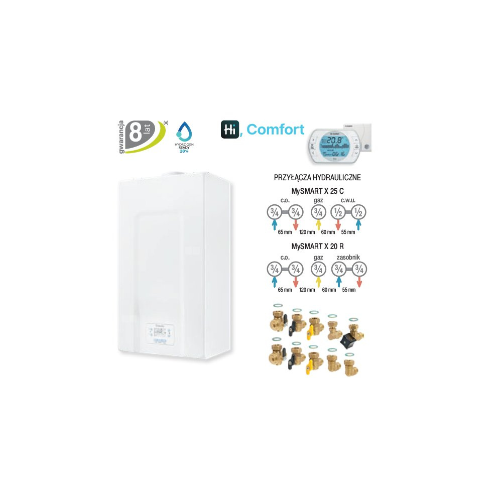 BERETTA PREZENTUJE MySMART X, NAJBARDZIEJ KOMPAKTOW Y KOCIOŁ KONDENSACYJNY W OFERCIE MARKI BERETTA I JEDEN Z NAJBARDZIEJ KOMPAKTOWYCH NA RYNKU, O GŁĘBOKOŚCI ZALEDWIE 249 MM. MYSMART X TO IDEALNE ROZWIĄZANIE NA WYMIANĘ I DO NOWYCH INSTALACJI. Kotły te wyróżnia elastyczność montażu, ponieważ można je również zainstalować w szafce kuchennej. MySMART X zapewnia użytkownikowi bezkompromisowy komfort, zarówno w funkcji centralnego ogrzewania, jak i produkcji ciepłej wody użytkowej, dzięki nowemu wymiennikowi głównemu ze stali nierdzewnej i zoptymalizowanemu płytowemu wymiennikowi c.w.u. Design kotłów MySMARTX jest zgodny z pozostałymi urządzeniami najnowszej generacji marki Beretta i z łatwością wkomponowuje się w każdą przestrzeń mieszkalną. Szeroki zakres modulacji mocy 1:8 i bardzo niska emisja NOx (najlepsza 6 klasa wg norm UE) oraz predyspozycje do pracy z mieszaniną gazu ziemnego i wodoru – maksymalnie do 20% – potwierdzają dużą świadomość ekologiczną marki Beretta, która przekłada się na rozwój wydajnych urządzeń o niskim wpływie na środowisko naturalne.