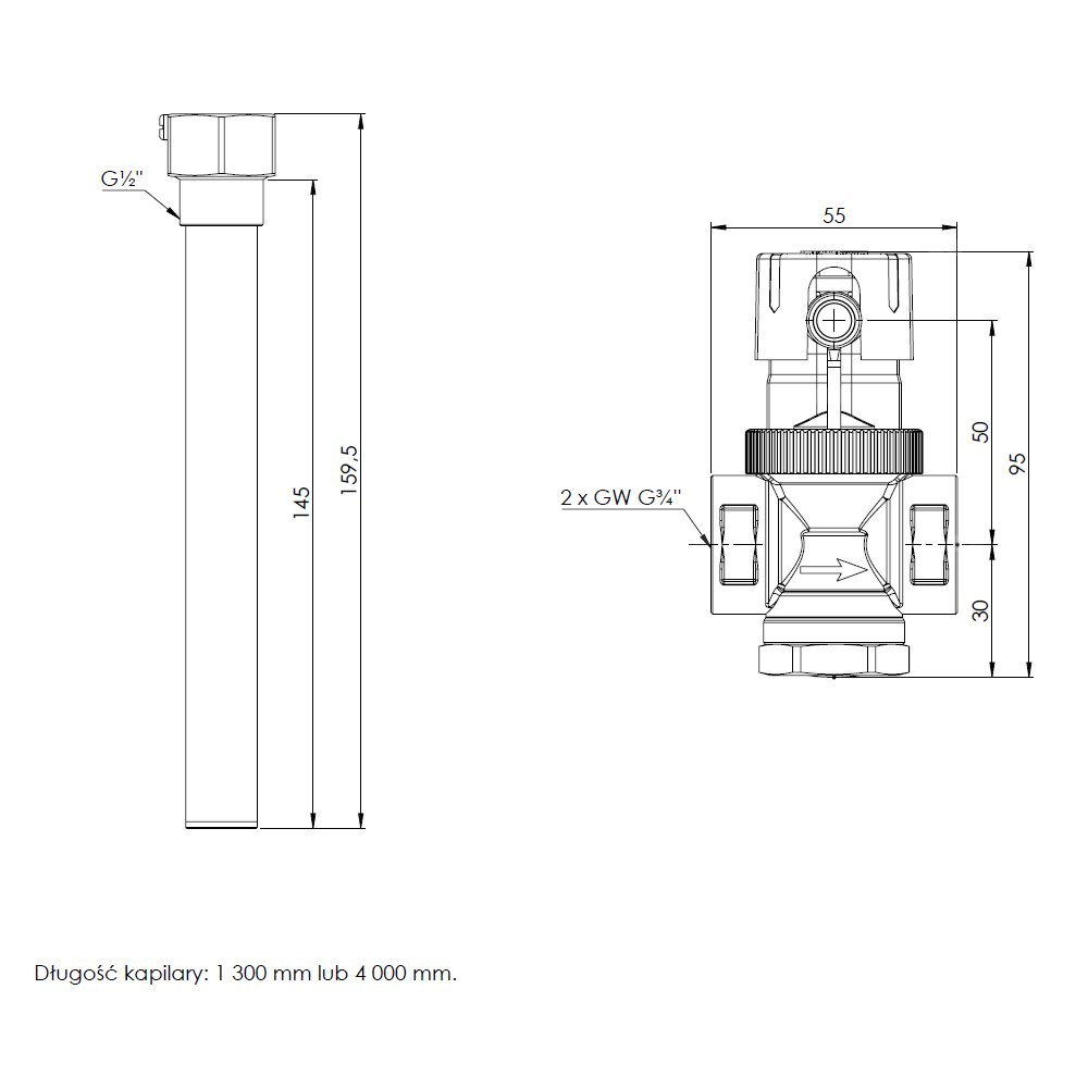 Korpus wykonany z mosiądzu z mechanizmem zaworowym oraz połączonego z nim kapilarą czujnika temperatury.