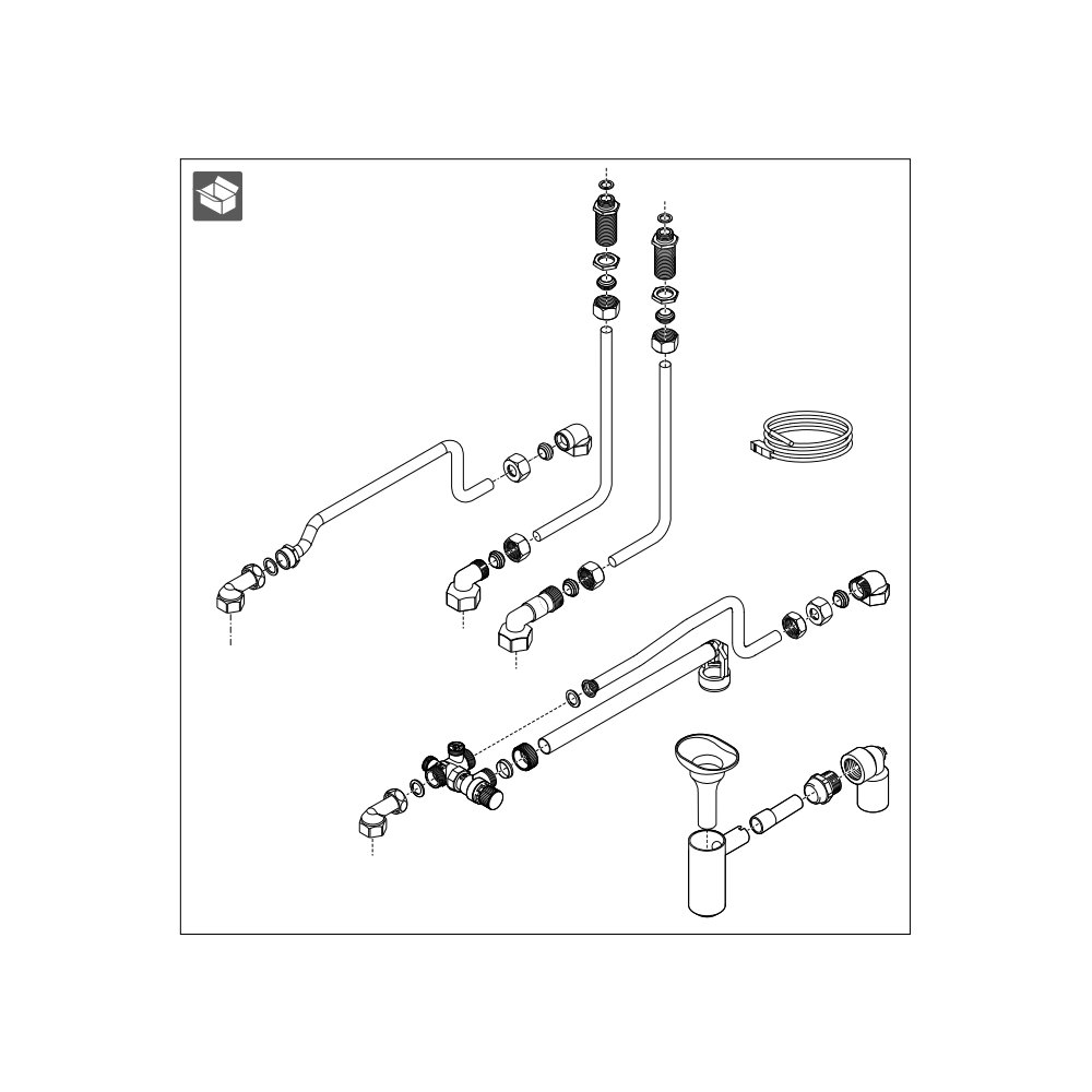 Natynkowy zestaw podłączeniowy do VIH R120/6 zawierający: podłączenie hydrauliczne z kotłem, czujnik temperatury c.w.u., syfon do zaworu bezpieczeństwa oraz grupę bezpieczeństwa bez reduktora ciśnienia wody zasilającej (dla maks. ciśnienia zasilania 1,0 MPa)