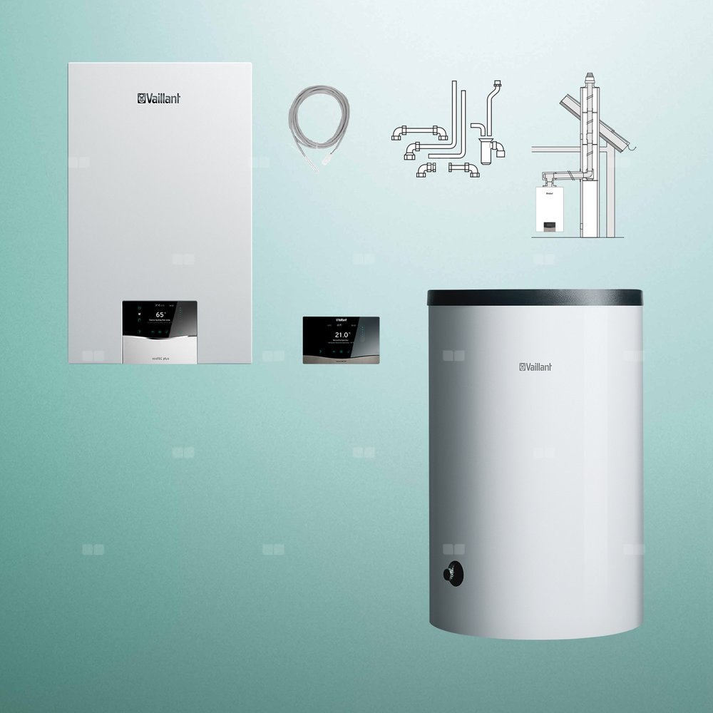 Pakiet kotła VC 15CS/1-5 ecoTEC plus z zasobnikiem VIH R 200/6B, zestawem złączek, grupą bezpieczeństwa, i regulatorem systemowym sensoCOMFORT 720. SPS do szachtu