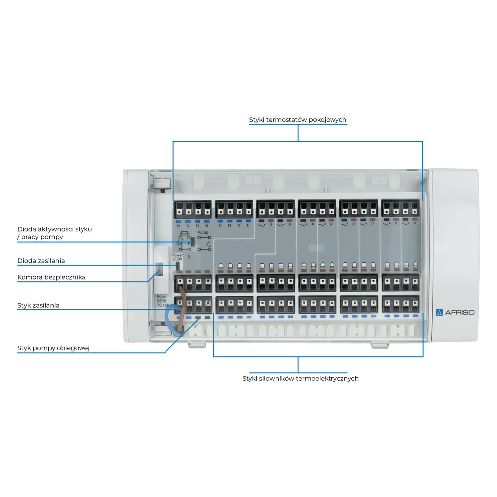 Obsługuje do 20 siłowników termoelektrycznych (2 strefy po 4 siłowniki, 6 stref po 2 siłowniki).