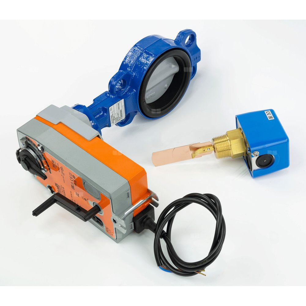 W module odcięcia MOIB 80 VP zastosowano przepustnicę centryczną, bez kołnierzową z wpustem wieloklinowym do połączenia trzpienia z dyskiem co pozwala na doskonałe przenoszenie momentu obrotowego na element zamykający. Wymienna okładzina i dysk pozwala na wieloletnią eksploatację urządzenia, korpus wykonany z żeliwa szarego GG25 epoksydowanego. Wykorzystany siłownik NZ ustawia zawór do pozycji roboczej, jednocześnie napinając sprężynę powrotną, w przypadku braku zasilania, sprężyna powrotna ustawia przepustnicę w pozycji zamkniętej. Siłownik montowany jest bezpośrednio na armaturze. Korba pozwala na ręczną regulację położenia dysku przepustnicy oraz zablokowanie w dowolnym położeniu przy użyciu przełącznika. Odblokowanie z ustawionej w ten sposób pozycji odbywa się ręcznie lub automatycznie poprzez podanie napięcia roboczego. Siłownik charakteryzuje się wysoką niezawodnością działania dzięki zintegrowanemu zabezpieczeniu przed przeciążeniem, nie wymaga wyłączników krańcowych i zatrzymuje się automatycznie po dojściu do zderzaka. Zastosowano czujnik przepływu typu łopatkowego, wyposażony w układ styków SPDT, które rozłączają obwód elektryczny w momencie pojawienia się przepływu. Łopatki wykonane są ze stopu miedzi. Budowa czujnika pozwala na zastosowanie jednego modelu dla rur o średnicy od 1 do 6 cali, segmentowa budowa łopatki pozwala na dostosowanie jej długości do średnicy rurociągu, czujnik dostarczony jest z nastawą na minimalne natężenie przepływu.