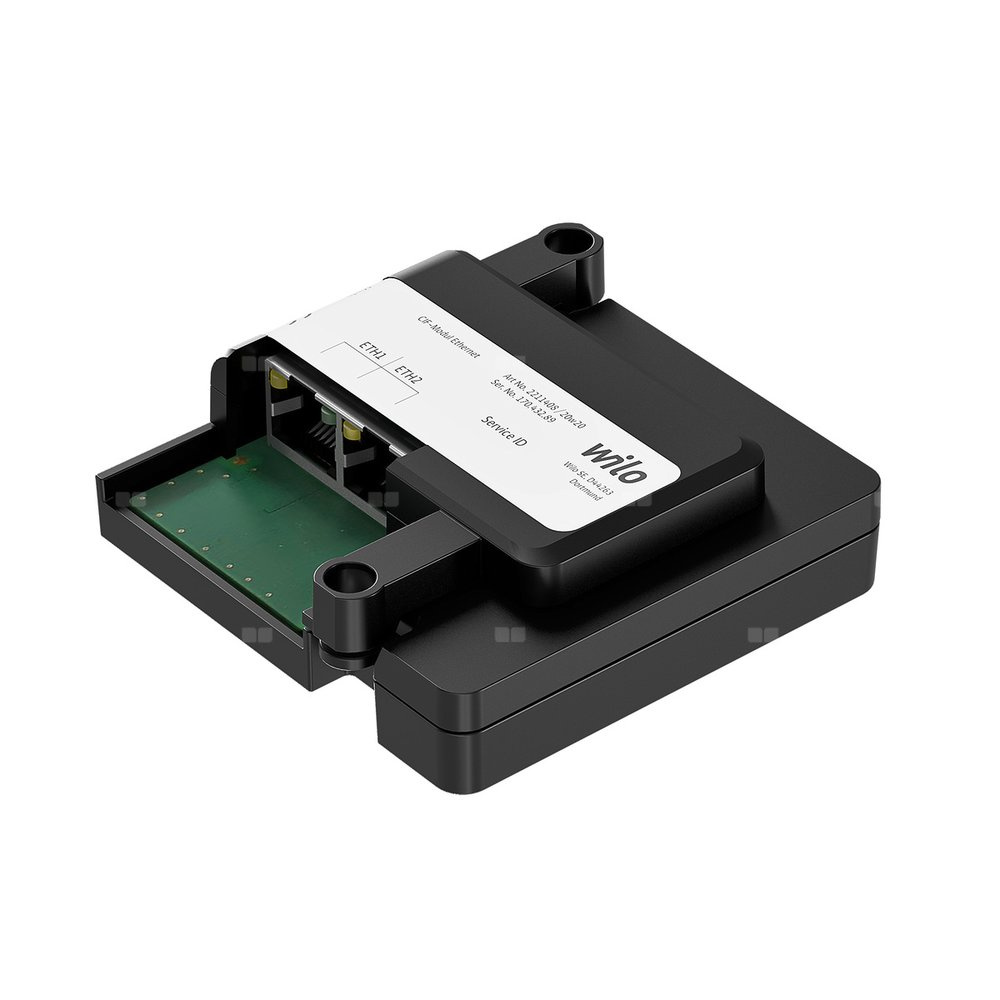 Moduł interfejsu Wilo-Moduł CIF Ethernet wtykowy z możliwością doposażenia w celu rozszerzenia interfejsów komunikacyjnych pompy o przyłącze sieciowe Ethernet. Możliwy jest wybór protokołów BACnet IP i Modbus TCP w konfiguracji.