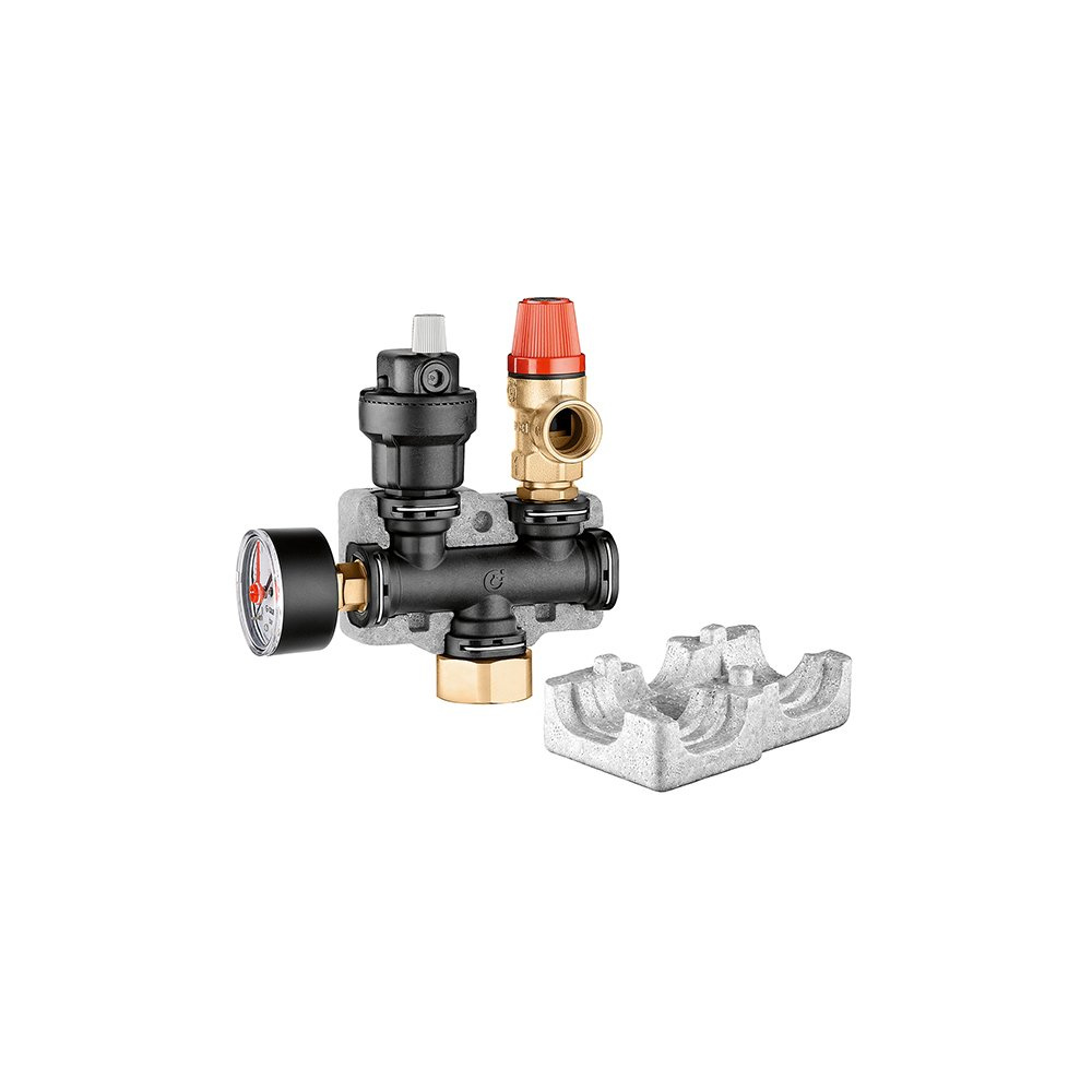 Grupa bezpieczeństwa z technopolimeru do instalacji grzewczych. Z izolacją. Wyposażona w: - automatyczny zawór odpowietrzający; - zawór bezpieczeństwa; - manometr Przyłącze: G 1" (ISO 228-1) GW. Zakres temperatury medium: 5–90 °C. Nastawa: 3 bar. Maksymalan moc upustowa: 50 kW.